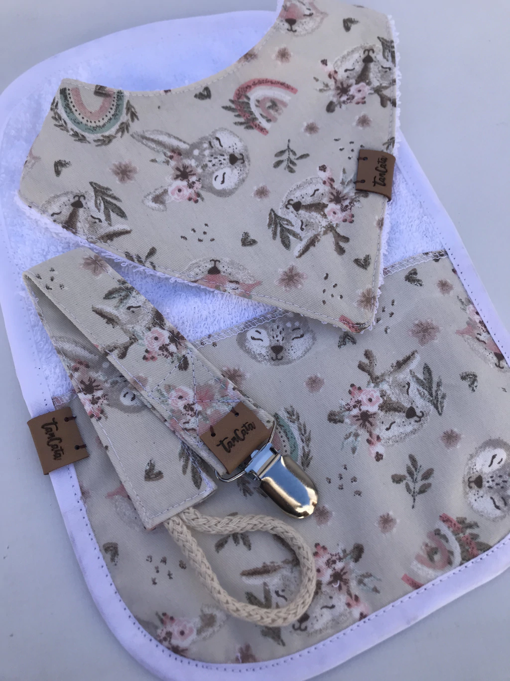 Babero bandana, babita y portachupete. Prácticos y siempre necesarios.