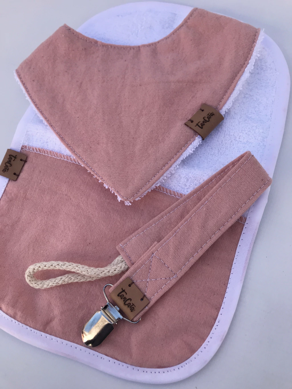 Set de babero bandana, babita y portachupete. Un básico que siempre es útil y además súper canchero.